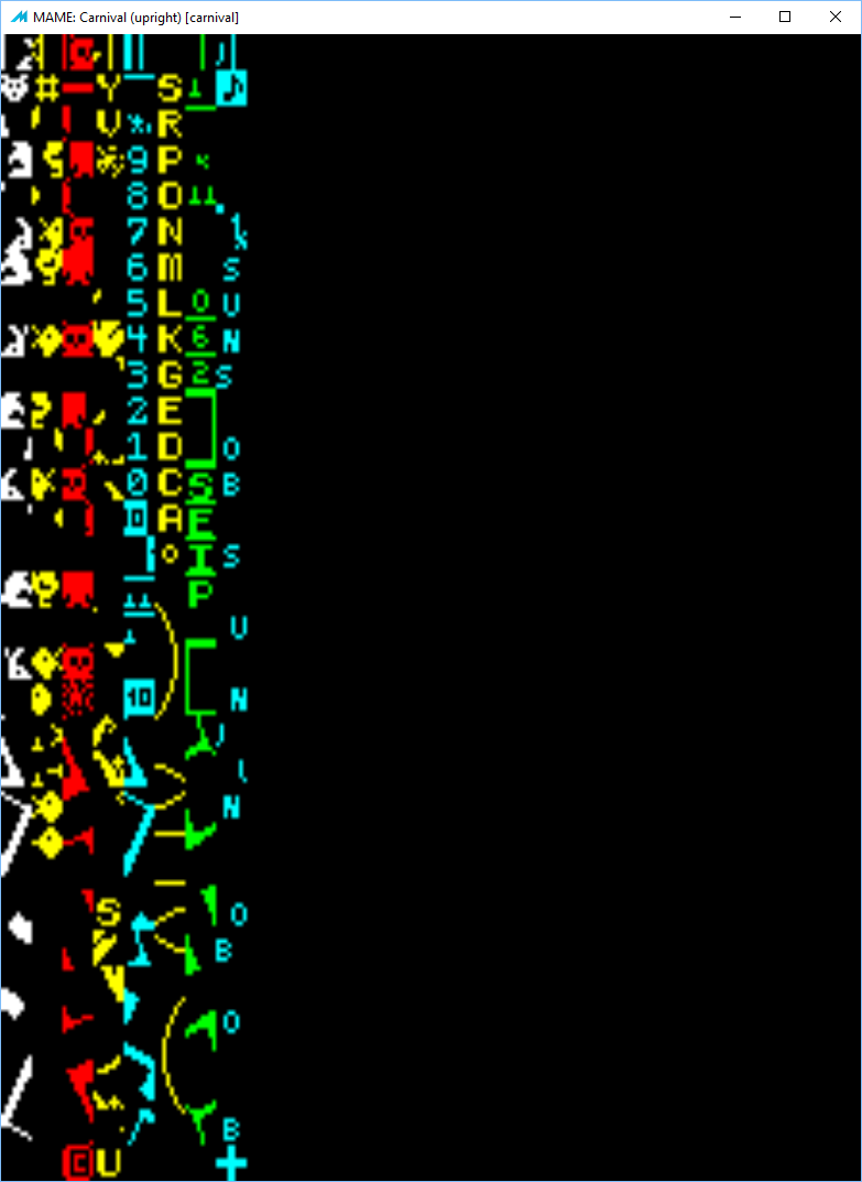 Important Note: The carnival hardware has ROM from 0x0000 - 0x3FFF HOWEVER it is mirrored into 0x4000 - 0x7FFF and this mirror MUST exist! The code calls routines in this upper address space (0x4000 etc) so if it's not mirrored things don't work!